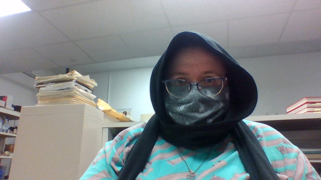 When your office is regularly cold, you have a short hairdo, and everyone is wearing masks, you end up looking a bit like a video game villain! Taking a brief break from cataloging to take this silly picture. Remember, today is Election Day, so if you haven’t already, get out there and vote!